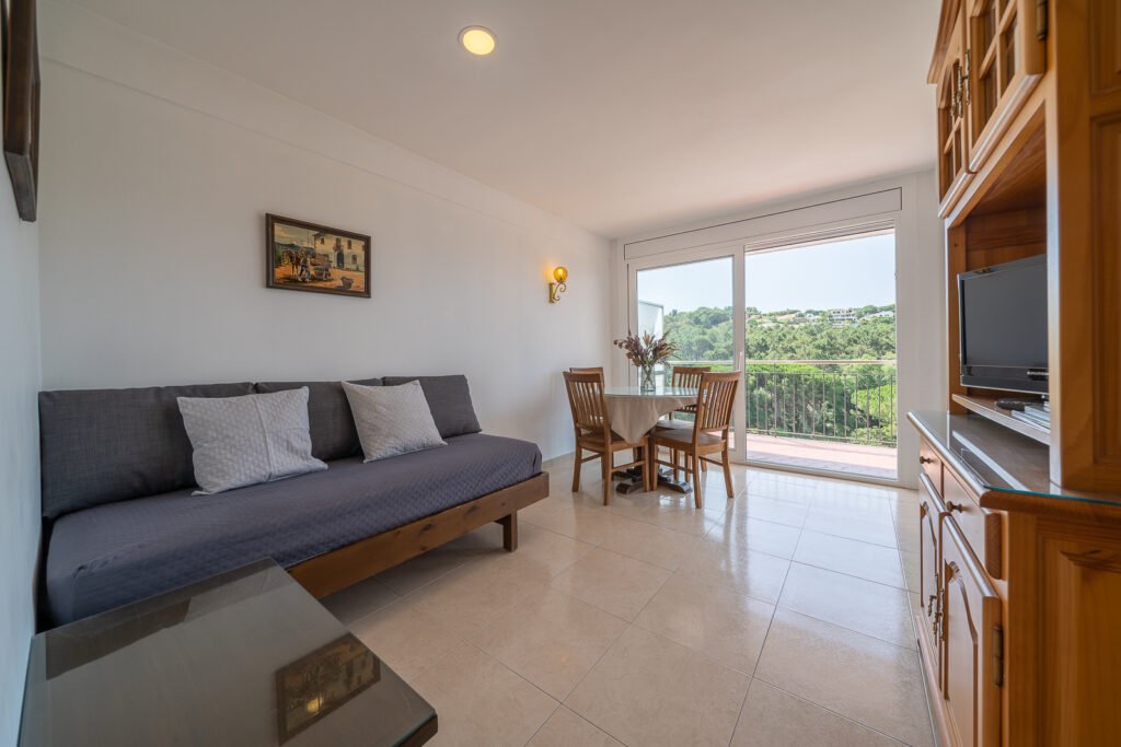 Apartamentos para 2/3 personas. Son amplios y luminosos, situados en la fachada principal del edificio, con vistas a una gran zona verde y montaña, algunos con vistas al mar. Disponen de una gran terraza privada. Se componen de una habitación doble con 2 camas, salón comedor con TV, cocina y baño con ducha. En el salón comedor hay 1 cama individual o un sofá cama para la tercera persona. La cocina dispone de los utensilios necesarios para cocinar. Hay microondas, cocina eléctrica, nevera, congelador, tostadora y cafetera italiana.