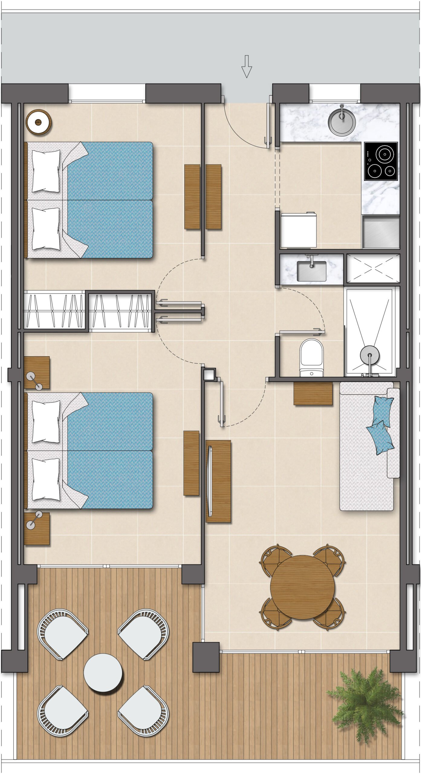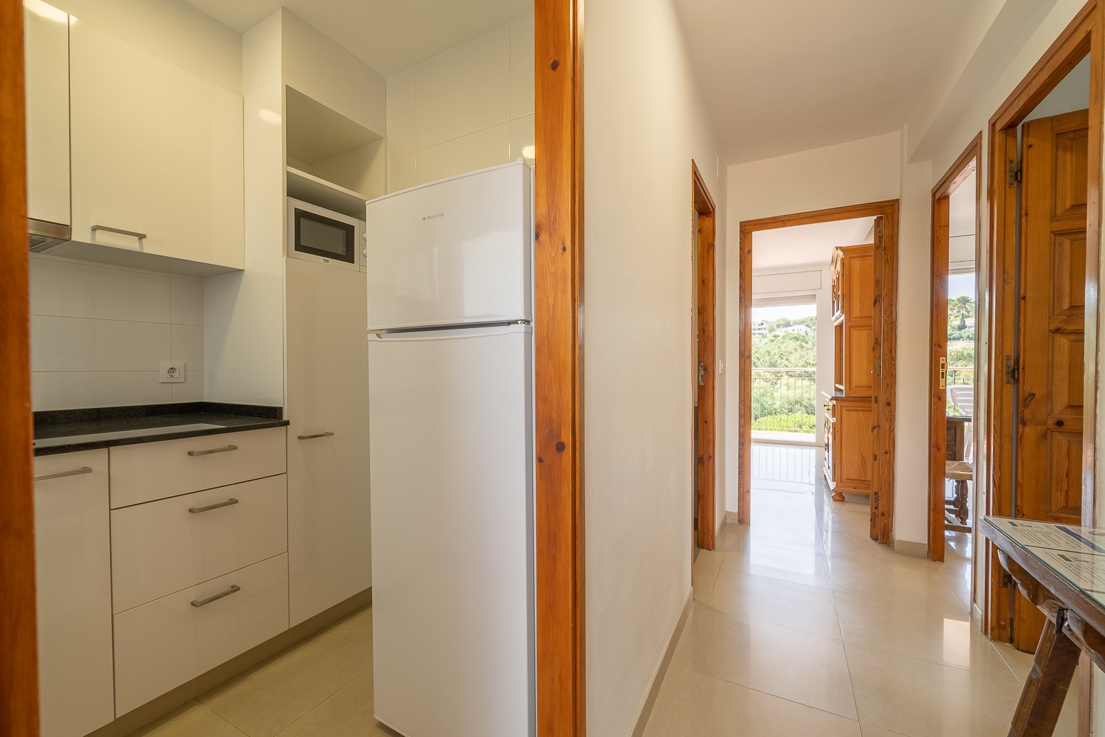 Apartamentos para 4/5 personas. Son amplios y luminosos, con vistas a una gran zona verde y montaña, algunos con vistas al mar. Disponen de una gran terraza privada. Se componen de dos habitaciones dobles con 2 camas, salón comedor con TV, cocina y baño con ducha. En el salón comedor hay 1 cama individual o un sofá cama para la quinta persona. La cocina dispone de los utensilios necesarios para cocinar. Hay microondas, cocina eléctrica, nevera, congelador, tostadora y cafetera italiana.